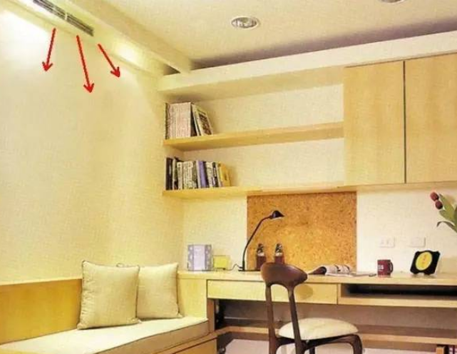 書房是安靜讀書學習的地方,空調安裝在正面直接吹在桌子上容易造成書或紙張被吹亂,而且迎面的熱風也容易造成人頭暈等過熱的感覺。